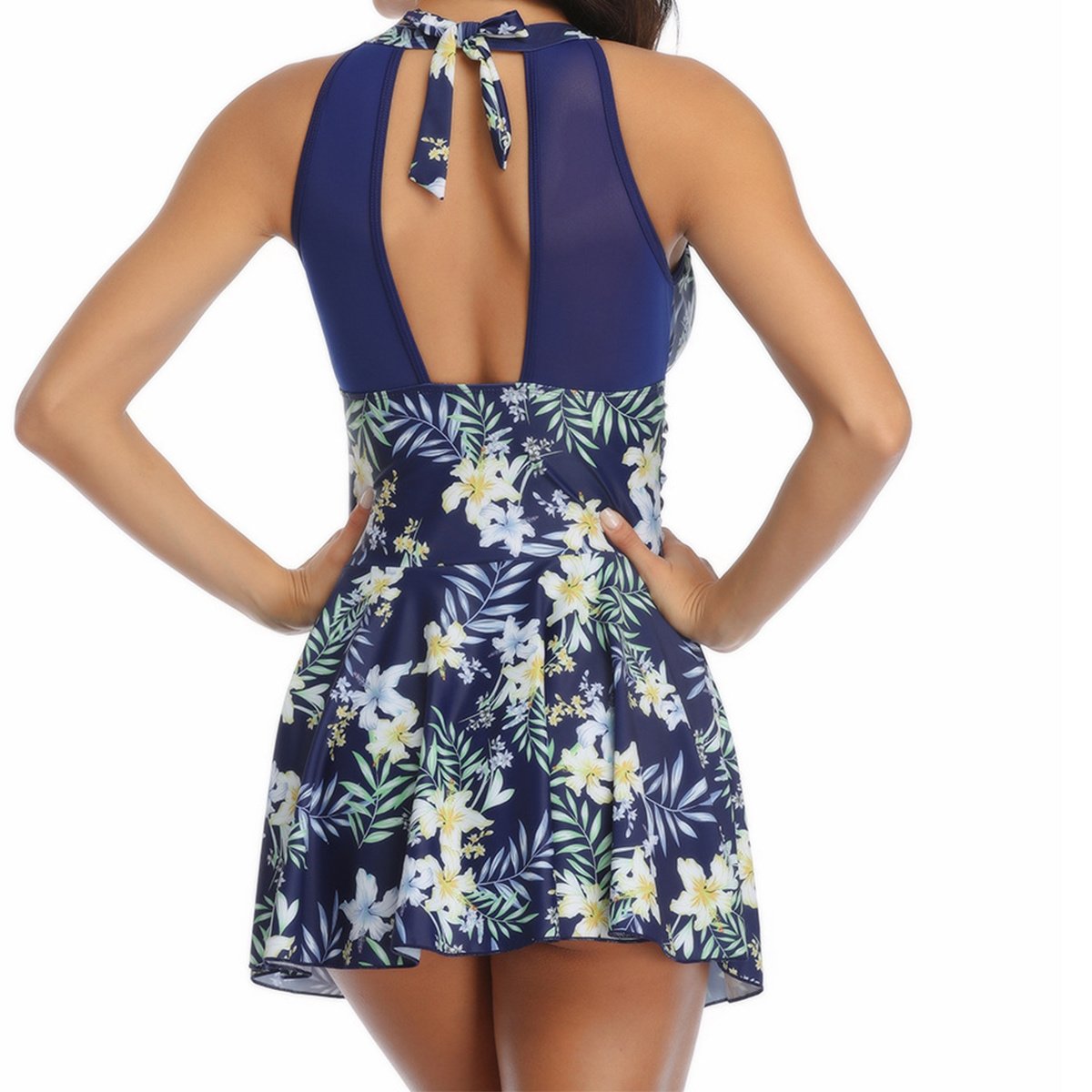 2.DESIGN: The one piece swimdress features laced-up high neck, mesh decoration and delicate skirt. Looks very flattering and elegant.