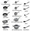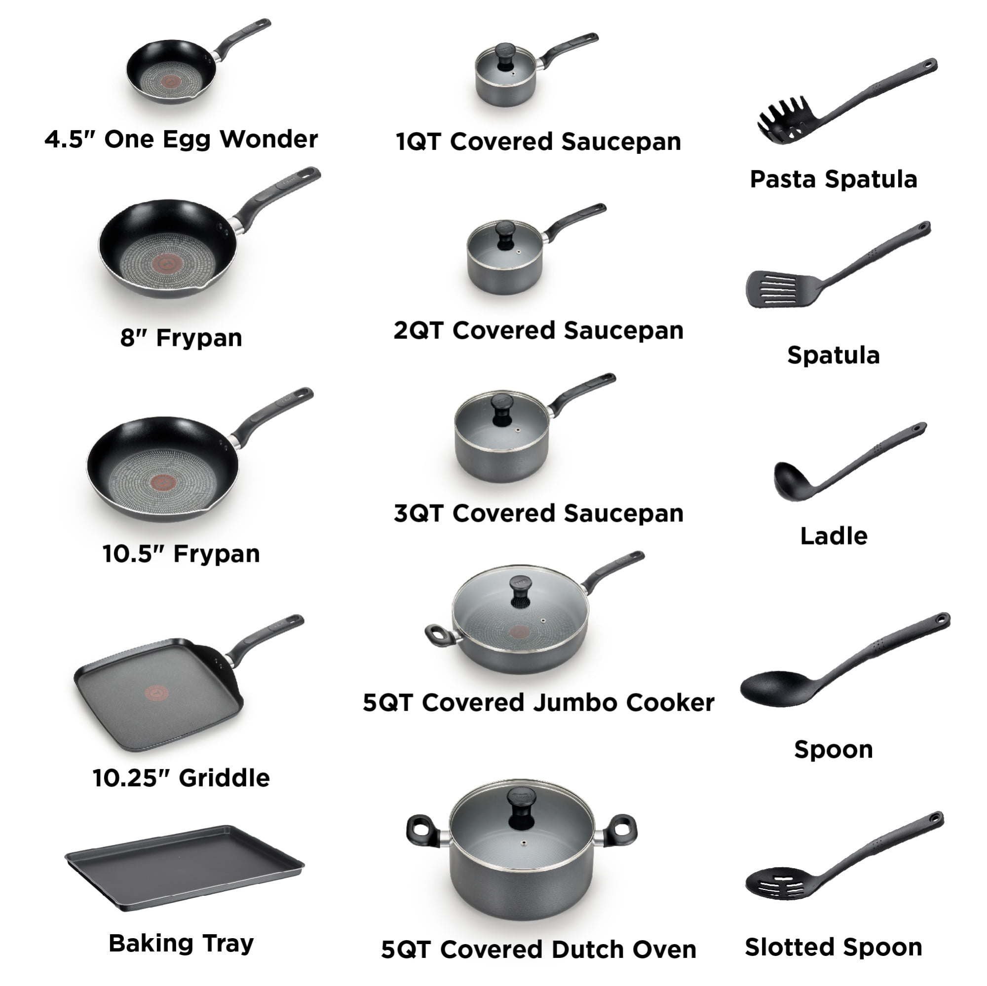 Ensuring reliable results when preparing meals for the whole family. Includes 4.5" One Egg Wonder, 8" fry pan with pouring spouts, 10.5" fry pan with pouring spouts, 10.25" griddle, 5QT jumbo cooker with glass lid, 1QT saucepan with glass lid, 2QT saucepan with glass lid, 3QT saucepan with glass lid, 5QT stewpot with glass lid, baking tray, pasta spatula, spatula, ladle, spoon, and slotted spoon.